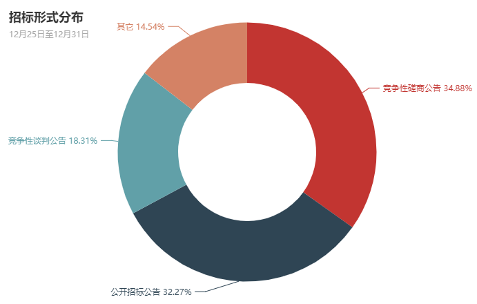 本周数据表明,河南政府采购市场中,公开招标、竞争性谈判和竞争性磋商形式在政府采购中依然占主体地位。