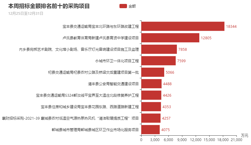 在本周政府采购的688个项目中,招标金额最大的十大项目依次为宝丰县交通运输局宝丰北环路与东环路改建工程、卢氏县教育体育局新建卢氏县育贤中学建设项目、内乡县宛梆艺术剧院、文化馆小剧场、音乐厅灯光音响建设项目施工及监理、永城市环卫一体化项目工程、杞县交通运输局杞县农村公路及桥梁灾后重建项目第一批、清丰县公安局智能交通建设项目、宝丰县交通运输局S324郸汝线平宝界至大温庄北段修复养护工程、宝丰县住房和城乡建设局宝丰县花园东路、西路道路新建工程、襄财招标采购-2021-39 襄城县农村低温空气源热泵热风机“清洁取暖提质工程”项目、郸城县城市管理局郸城县城区环卫作业市场化服务项目。该十大项目招标总金额为7.32亿元,占本周项目招标总金额的24.93%,其中排名第一的是宝丰县交通运输局宝丰北环路与东环路改建工程,招标金额为1.83亿元,占本周项目招标总金额的6.24%。