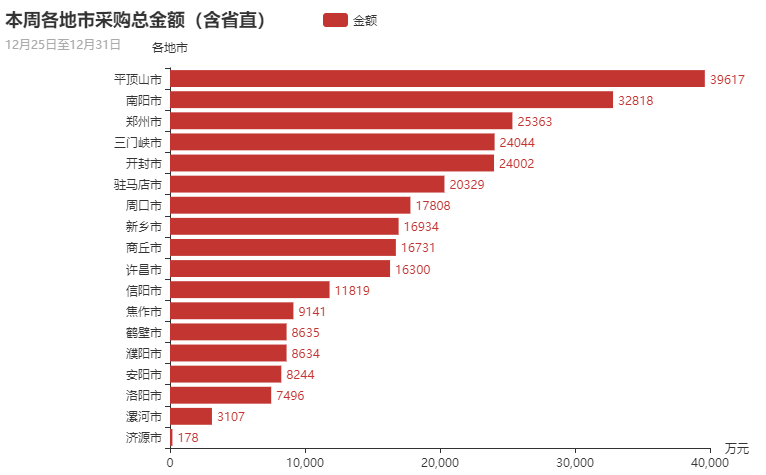 从采购金额总量分布上来看,本周平顶山市、南阳市、郑州市、三门峡市、开封市政府采购市场需求占主导地位。