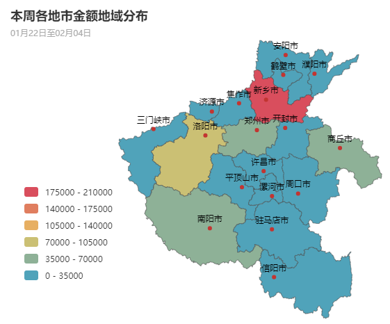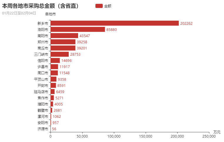 从采购金额总量分布上来看,本周新乡市、洛阳市、南阳市、郑州市、商丘市政府采购市场需求占主导地位。