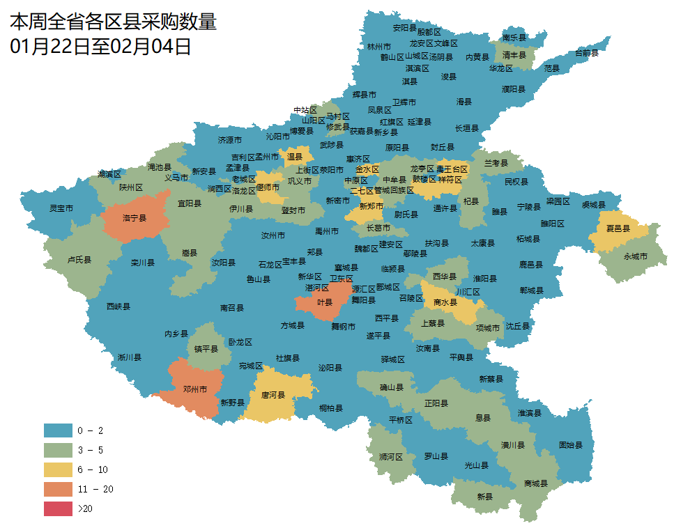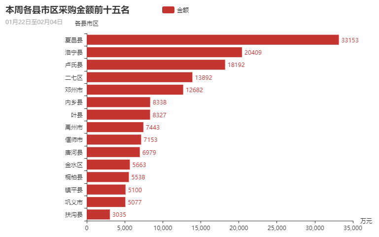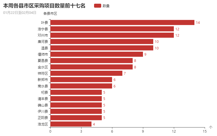 全省各县市区本周采购的项目为294个,占本周采购项目总量的75.38%。县市区排名前十七的依次为叶县、洛宁县、邓州市、唐河县、温县、偃师市、夏邑县、金水区、祥符区、新郑市、商水县、杞县、清丰县、确山县、伊川县、正阳县、洛龙区。排名前十七的各县市区本周采购项目数量总量为131个,占全省各县市区采购总数量的44.56%。