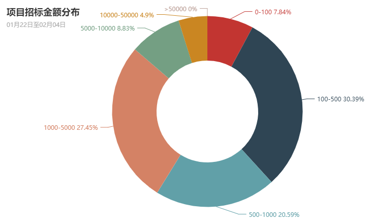 在招标的392个项目中,招标金额披露的项目有392个。其中招标金额在0-100万元之间的项目有67个,招标金额在100-500万元之间的项目有231个,招标金额在500-1000万元之间的项目有39个,招标金额在1000-5000万元之间的项目有39个,招标金额在5000-10000万元之间的项目有11个,招标金额在大于10000万元之间的项目有5个。统计数据显示,500万元以下的政府采购项目有298个,占同期采购项目总量的76.02%。