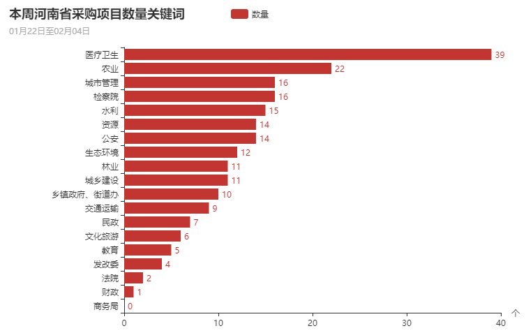 根据本周政府采购关键词检索,本周采购主体排名前十的主要是医疗卫生、农业、城市管理、检察院、水利、资源、公安、生态环境、林业、城乡建设等部门。以上部门采购项目总数量为170个,占总部门的79.44%。