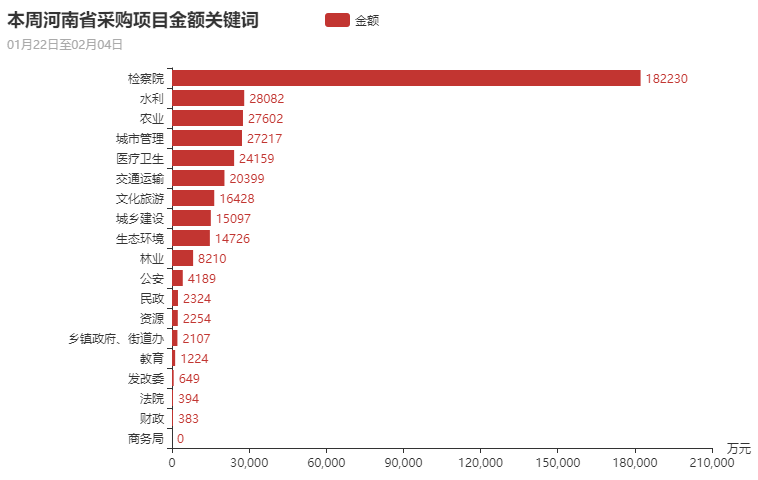 6、本周采购主体排名前十的主要是医疗卫生、农业、城市管理、检察院、水利、资源、公安、生态环境、林业、城乡建设等部门,采购项目总数量为170个,占本周政府采购项目总量比例79.44%;本周采购主体排名前十的主要是检察院、水利、农业、城市管理、医疗卫生、交通运输、文化旅游、城乡建设、生态环境、林业等部门,采购项目总金额为36.41亿元,占本周政府采购项目总额比例接近96.42%。