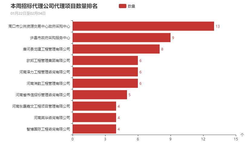 本周参与政府采购的招标代理机构为246家,本周代理项目数量最多的十家代理机构分别为周口市公共资源交易中心政府采购中心、许昌市政府采购服务中心、唐河县龙建工程管理有限公司、欧邦工程管理集团有限公司、河南泽力工程管理咨询有限公司、河南湍韵工程管理有限公司、河南省伟信招标管理咨询有限公司、河南东晟嘉文工程项目管理有限公司、河南英华咨询有限公司、智博国际工程咨询有限公司。其中周口市公共资源交易中心政府采购中心本周代理13个项目处于首位。