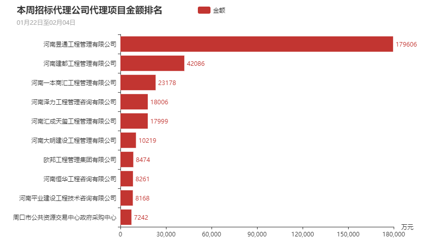 本周参与政府采购的招标代理机构为246家,本周代理项目金额最大的十家代理机构分别为河南昱通工程管理有限公司、河南建都工程管理有限公司、河南一本商汇工程管理有限公司、河南泽力工程管理咨询有限公司、河南汇成天玺工程管理有限公司、河南大明建设工程管理有限公司、欧邦工程管理集团有限公司、河南恒华工程咨询有限公司、河南平业建设工程技术咨询有限公司、周口市公共资源交易中心政府采购中心。其中河南昱通工程管理有限公司本周代理金额为17.96亿元处于首位。