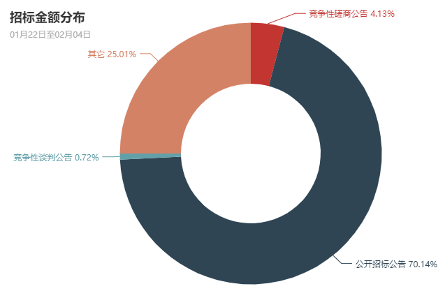 本周政府采购项目中,以公开招标形式采购项目总金额为36.18亿元,占比70.14%;以竞争性谈判形式采购项目总金额为0.37亿元,占比0.72%;以竞争性磋商形式采购项目总金额为2.12亿元,占比4.13%;以其它形式招标(含询价、资格预审)采购项目总金额为12.9亿元,占比为25.01%。根据招标金额统计,采用公开招标形式的项目平均采购金额为2103万元,采用竞争性谈判和竞争性磋商形式的项目平均采购金额为149万元和181万元,采用其他招标形式的项目平均采购金额为1654万元。