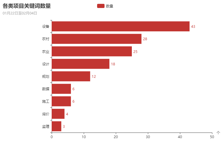 在本周的政府采购项目中,设备、农村类项目占比最大,其次为农业类、设计类、规划类、数据类、施工类、询价类、监理类。数据表明,设备、农村类项目已经成为政府采购的主要方向。
