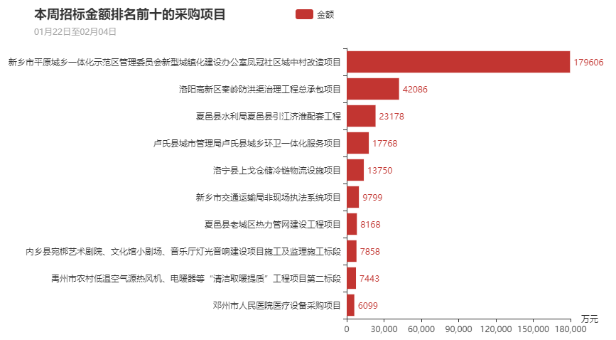 在本周政府采购的392个项目中,招标金额最大的十大项目依次为新乡市平原城乡一体化示范区管理委员会新型城镇化建设办公室凤冠社区城中村改造项目、洛阳高新区秦岭防洪渠治理工程总承包项目、夏邑县水利局夏邑县引江济淮配套工程、卢氏县城市管理局卢氏县城乡环卫一体化服务项目、洛宁县上戈仓储冷链物流设施项目、新乡市交通运输局非现场执法系统项目、夏邑县老城区热力管网建设工程项目、内乡县宛梆艺术剧院、文化馆小剧场、音乐厅灯光音响建设项目施工及监理施工标段、禹州市农村低温空气源热风机、电暖器等“清洁取暖提质”工程项目第二标段、邓州市人民医院医疗设备采购项目。该十大项目招标总金额为31.57亿元,占本周项目招标总金额的61.2%,其中排名第一的是新乡市平原城乡一体化示范区管理委员会新型城镇化建设办公室凤冠社区城中村改造项目,招标金额为17.96亿元,占本周项目招标总金额的34.81%。