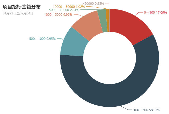 3、本周招标金额最大的十大项目中,主要集中于交通、人居环境改善、农业等领域;500万元以下的政府采购项目有298个,占同期采购项目总量的76.02%。