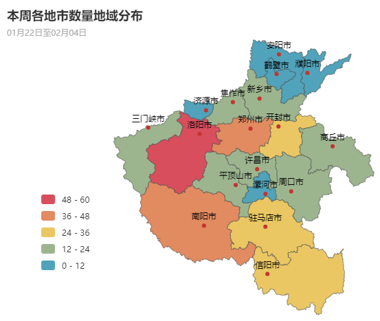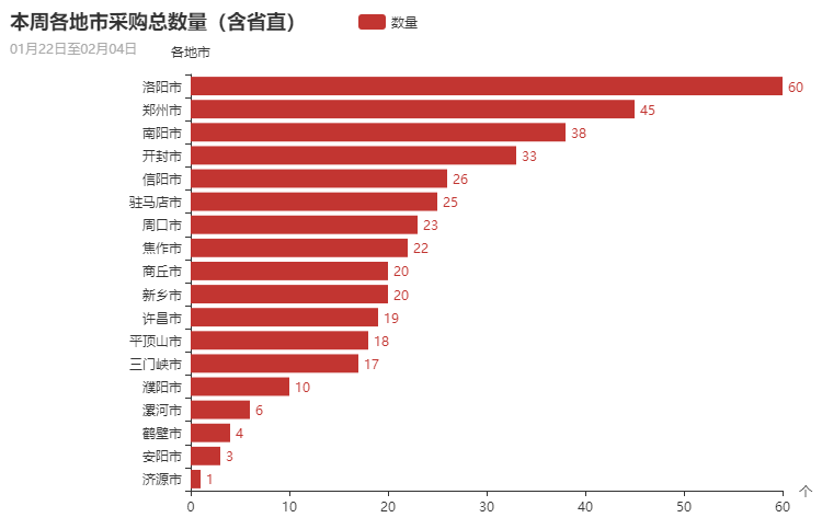 从采购项目总量分布上来看,本周洛阳市、郑州市、南阳市、开封市、信阳市政府采购市场需求占主导地位。