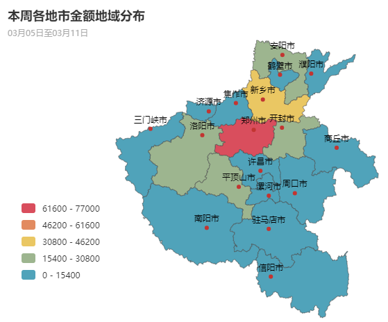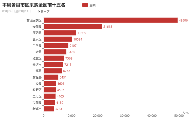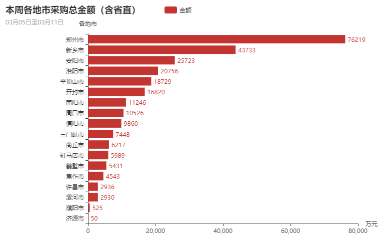 从采购金额总量分布上来看,本周郑州市、新乡市、安阳市、洛阳市、平顶山市政府采购市场需求占主导地位。