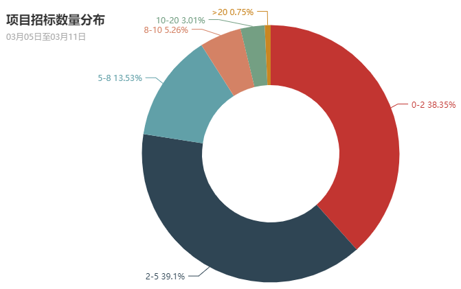 全省各县市区本周采购的项目为539个。其中有51个县市区采购项目小于2个,占全部采购县市区的38.35%;有52个县市区采购项目在2至5个,占全部采购县市区的39.1%;有18个县市区采购项目在5至8个,占全部采购县市区的13.53%;有7个县市区采购项目在8至10个,占全部采购县市区的5.26%;有4个县市区采购项目在10至20个,占全部采购县市区的3.01%;有1个县市区采购项目大于20个,占全部采购县市区的0.75%。