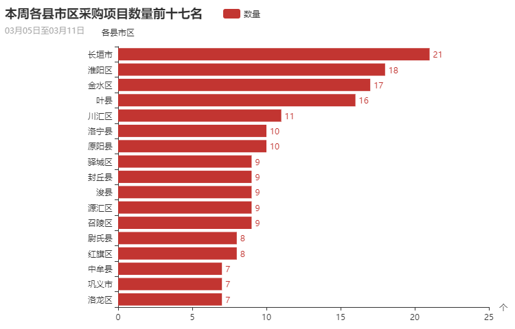 全省各县市区本周采购的项目为539个。县市区排名前十七的依次为长垣市、淮阳区、金水区、叶县、川汇区、洛宁县、原阳县、驿城区、封丘县、浚县、源汇区、召陵区、尉氏县、红旗区、中牟县、巩义市、洛龙区。排名前十七的各县市区本周采购项目数量总量为185个,占全省各县市区采购总数量的34.32%。