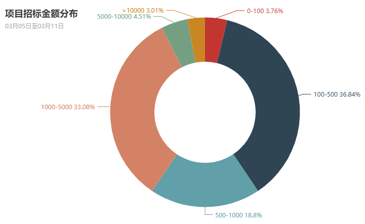 2、本周公开招标、竞争性谈判和竞争性磋商形式在政府采购中依然占主体地位;单项目招标金额基本体现了以公开招标为主流、多种采购形式为补充的灵活多变的政府采购形式;农村、设备类项目占比最大,其次为农业类、规划类、设计类、询价类、数据类、监理类、施工类。