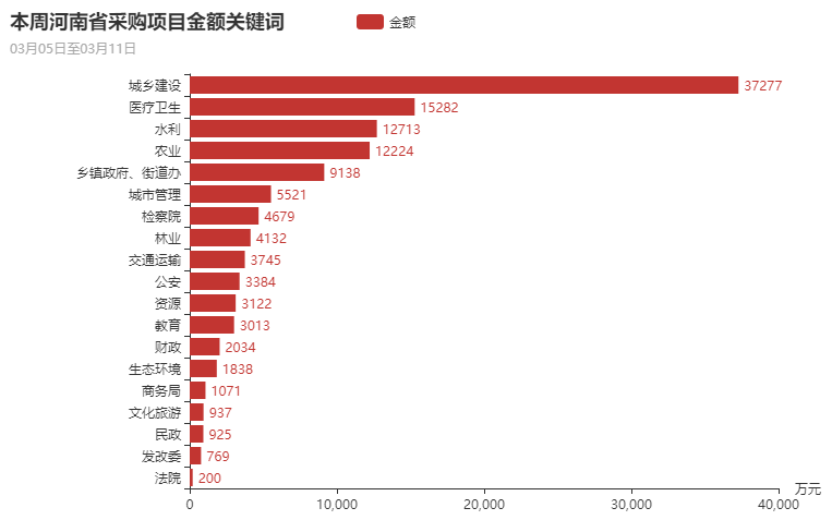 根据本周政府采购项目采购金额分析,本周采购主体排名前十的主要是城乡建设、医疗卫生、水利、农业、乡镇政府、街道办、城市管理、检察院、林业、交通运输、公安等部门。以上部门采购项目总金额为10.81亿元,占总部门的88.6%。