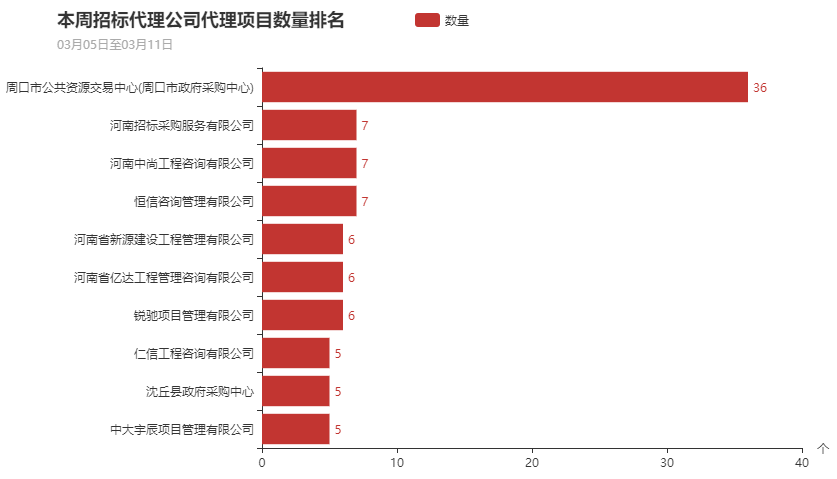 本周参与政府采购的招标代理机构为310家,本周代理项目数量最多的十家代理机构分别为周口市公共资源交易中心(周口市政府采购中心)、河南招标采购服务有限公司、河南中尚工程咨询有限公司、恒信咨询管理有限公司、河南省新源建设工程管理有限公司、河南省亿达工程管理咨询有限公司、锐驰项目管理有限公司、仁信工程咨询有限公司、沈丘县政府采购中心、中大宇辰项目管理有限公司。其中周口市公共资源交易中心(周口市政府采购中心)本周代理36个项目处于首位。
