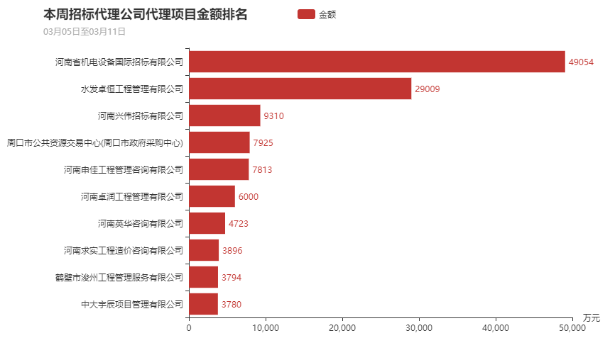 本周参与政府采购的招标代理机构为310家,本周代理项目金额最大的十家代理机构分别为河南省机电设备国际招标有限公司、水发卓恒工程管理有限公司、河南兴伟招标有限公司、周口市公共资源交易中心(周口市政府采购中心)、河南申佳工程管理咨询有限公司、河南卓润工程管理有限公司、河南英华咨询有限公司、河南求实工程造价咨询有限公司、鹤壁市浚州工程管理服务有限公司、中大宇辰项目管理有限公司。其中河南省机电设备国际招标有限公司本周代理金额为4.91亿元处于首位。