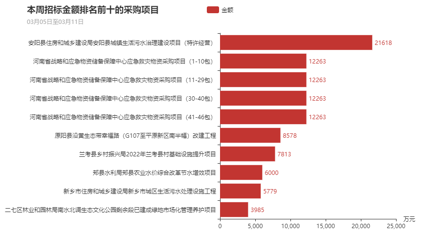 在本周政府采购的539个项目中,招标金额最大的十大项目依次为安阳县住房和城乡建设局安阳县城镇生活污水治理建设项目(特许经营)、河南省战略和应急物资储备保障中心应急救灾物资采购项目(41-46包)、河南省战略和应急物资储备保障中心应急救灾物资采购项目(30-40包)、河南省战略和应急物资储备保障中心应急救灾物资采购项目(11-29包)、河南省战略和应急物资储备保障中心应急救灾物资采购项目(1-10包)、原阳县沿黄生态带幸福路(G107至平原新区南半幅)改建工程、兰考县乡村振兴局2022年兰考县村基础设施提升项目、郏县水利局郏县农业水价综合改革节水增效项目、新乡市住房和城乡建设局新乡市城区生活污水处理设施工程、二七区林业和园林局南水北调生态文化公园剩余段已建成绿地市场化管理养护项目。该十大项目招标总金额为10.28亿元,占本周项目招标总金额的38.13%,其中排名第一的是安阳县住房和城乡建设局安阳县城镇生活污水治理建设项目(特许经营),招标金额为2.16亿元,占本周项目招标总金额的8.02%。