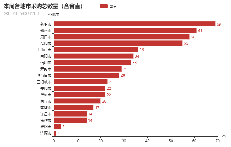 从采购项目总量分布上来看,本周新乡市、郑州市、周口市、洛阳市、平顶山市政府采购市场需求占主导地位。
