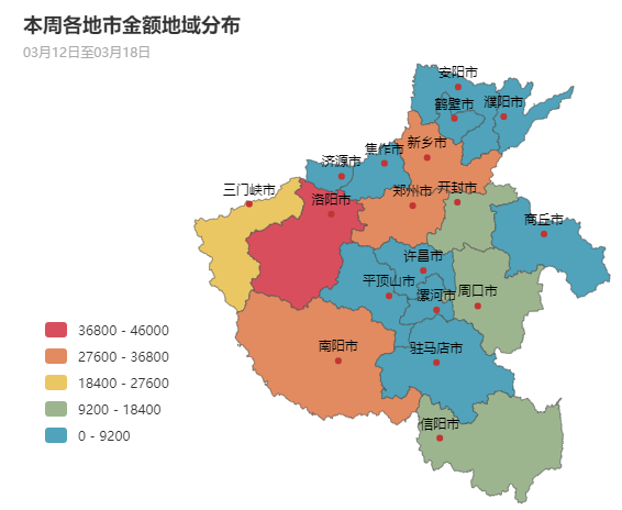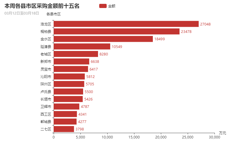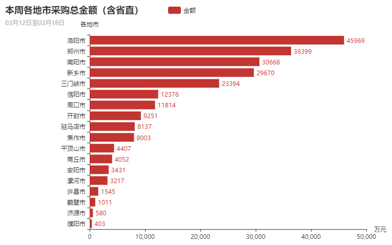 从采购金额总量分布上来看,本周洛阳市、郑州市、南阳市、新乡市、三门峡市政府采购市场需求占主导地位。