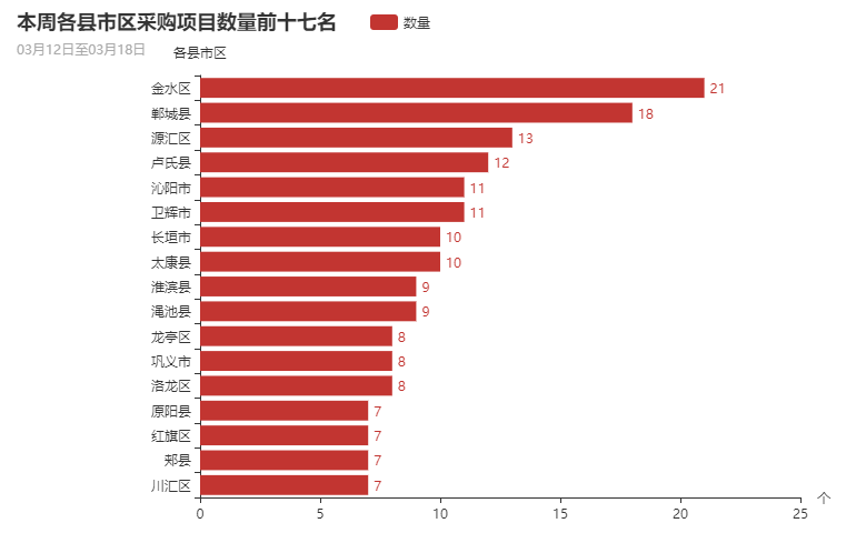 全省各县市区本周采购的项目为503个。县市区排名前十七的依次为金水区、郸城县、源汇区、卢氏县、沁阳市、卫辉市、长垣市、太康县、淮滨县、渑池县、龙亭区、巩义市、洛龙区、原阳县、红旗区、郏县、川汇区。排名前十七的各县市区本周采购项目数量总量为176个,占全省各县市区采购总数量的34.99%。