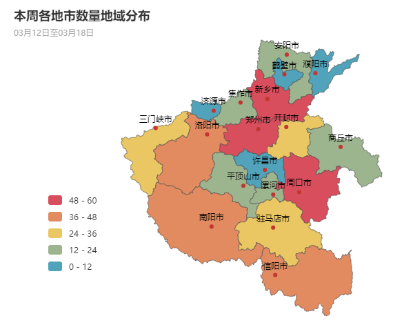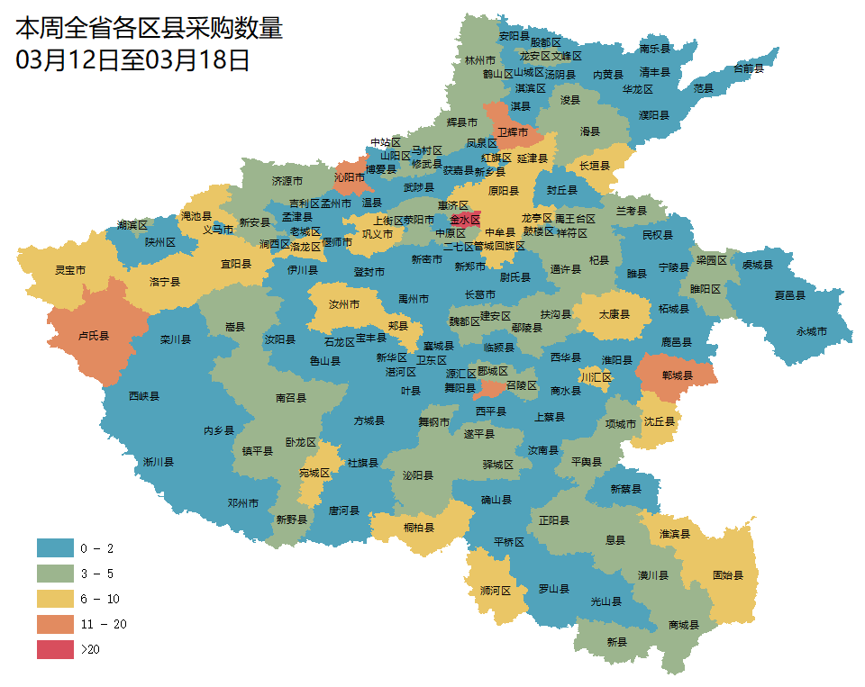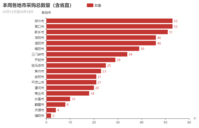 从采购项目总量分布上来看,本周郑州市、周口市、新乡市、洛阳市、信阳市政府采购市场需求占主导地位。