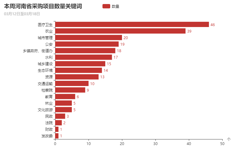 根据本周政府采购关键词检索,本周采购主体排名前十的主要是医疗卫生、农业、城市管理、公安、乡镇政府、街道办、水利、城乡建设、生态环境、资源、交通运输等部门。以上部门采购项目总数量为211个,占总部门的86.83%。