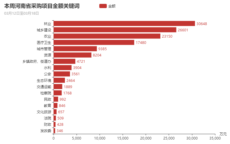 根据本周政府采购项目采购金额分析,本周采购主体排名前十的主要是林业、城乡建设、农业、医疗卫生、城市管理、资源、乡镇政府、街道办、水利、公安、生态环境等部门。以上部门采购项目总金额为13.01亿元,占总部门的94.6%。