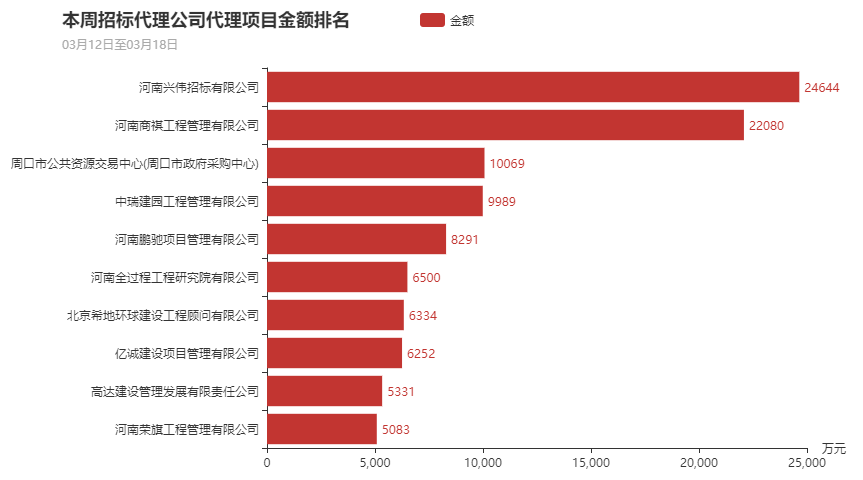 本周参与政府采购的招标代理机构为307家,本周代理项目金额最大的十家代理机构分别为河南兴伟招标有限公司、河南商祺工程管理有限公司、周口市公共资源交易中心(周口市政府采购中心)、中瑞建园工程管理有限公司、河南鹏驰项目管理有限公司、河南全过程工程研究院有限公司、北京希地环球建设工程顾问有限公司、亿诚建设项目管理有限公司、高达建设管理发展有限责任公司、河南荣旗工程管理有限公司。其中河南兴伟招标有限公司本周代理金额为2.46亿元处于首位。
