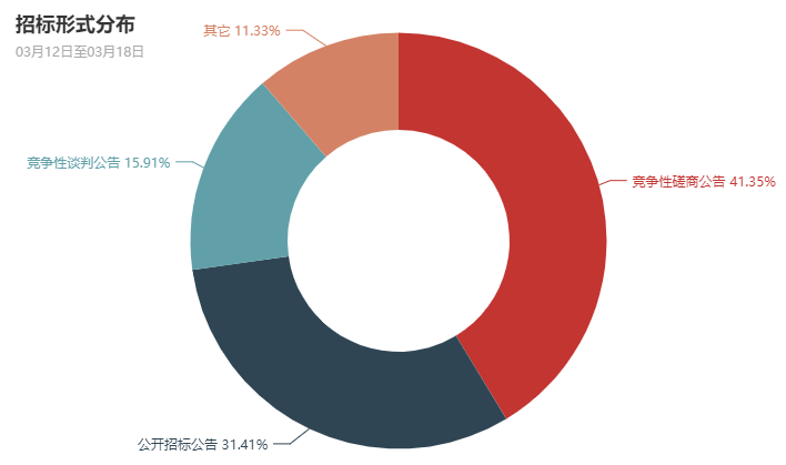2、本周公开招标、竞争性谈判和竞争性磋商形式在政府采购中依然占主体地位;单项目招标金额基本体现了以公开招标为主流、多种采购形式为补充的灵活多变的政府采购形式;设备、农村类项目占比最大,其次为农业类、设计类、规划类、施工类、监理类、询价类、数据类。