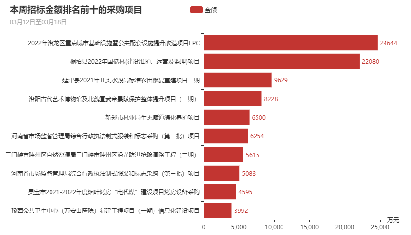 在本周政府采购的503个项目中,招标金额最大的十大项目依次为2022年洛龙区重点城市基础设施暨公共配套设施提升改造项目EPC、桐柏县2022年国储林(建设维护、运营及监理)项目、延津县2021年Ⅱ类水毁高标准农田修复重建项目一期、洛阳古代艺术博物馆及北魏宣武帝景陵保护整体提升项目(一期)、新郑市林业局生态廊道绿化养护项目、河南省市场监督管理局综合行政执法制式服装和标志采购(第一批)项目、三门峡市陕州区自然资源局三门峡市陕州区沿黄防洪抢险道路工程(二期)、河南省市场监督管理局综合行政执法制式服装和标志采购(第三批)项目、灵宝市2021-2022年度烟叶烤房“电代煤”建设项目烤房设备采购、豫西公共卫生中心(万安山医院)新建工程项目(一期)信息化建设项目。该十大项目招标总金额为9.66亿元,占本周项目招标总金额的41.23%,其中排名第一的是2022年洛龙区重点城市基础设施暨公共配套设施提升改造项目EPC,招标金额为2.46亿元,占本周项目招标总金额的10.52%。