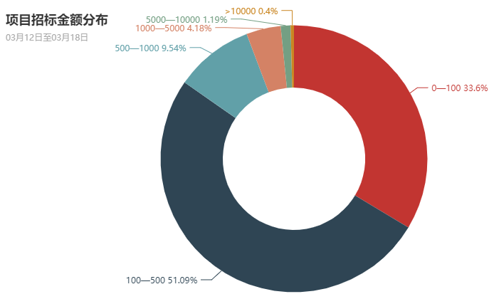 3、本周招标金额最大的十大项目中,主要集中于交通、人居环境改善、农业等领域;500万元以下的政府采购项目有426个,占同期采购项目总量的84.69%。