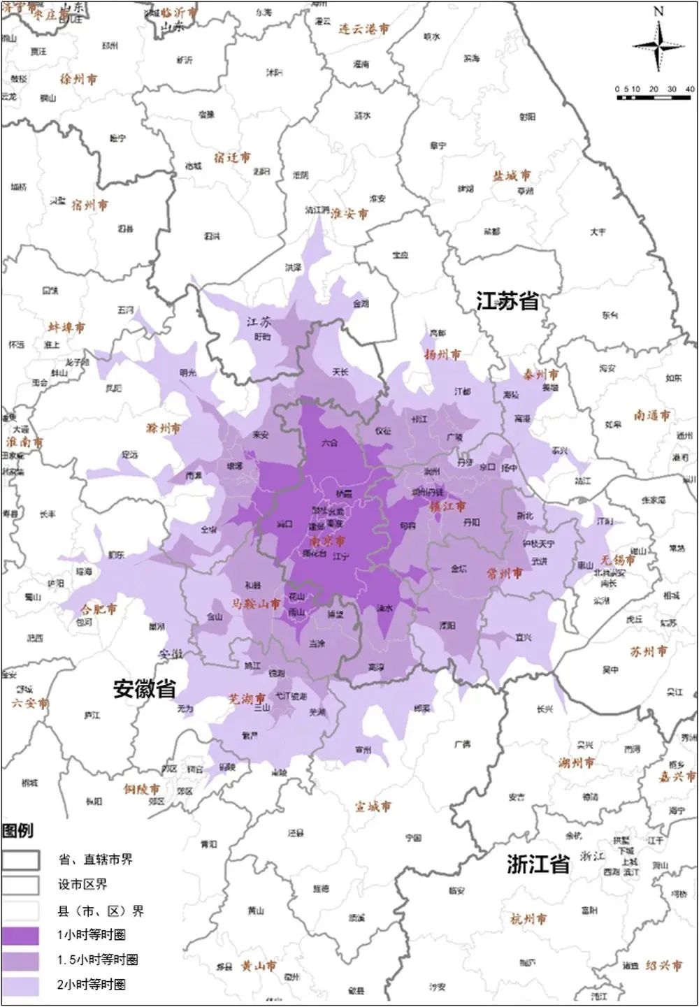 密切的交通网络是推进都市圈同城化发展的重要抓手,也是加强都市圈城市间要素流动的重要基础。根据互联网地图导航大数据测算,以南京市中心区为基点,以区县为基本单元,主要纳入1小时通勤圈(由于1小时通勤圈数据难以直接获取,采用以南京市中心为起点到周边区县的机动车1.5-2.0小时出行范围,即1.5-2.0小时等时圈作为替代指标,近似反应1小时通勤圈的范围。)内的区县,作为确定都市范围的基本条件。这符合都市圈之间交通联系的基本要求。