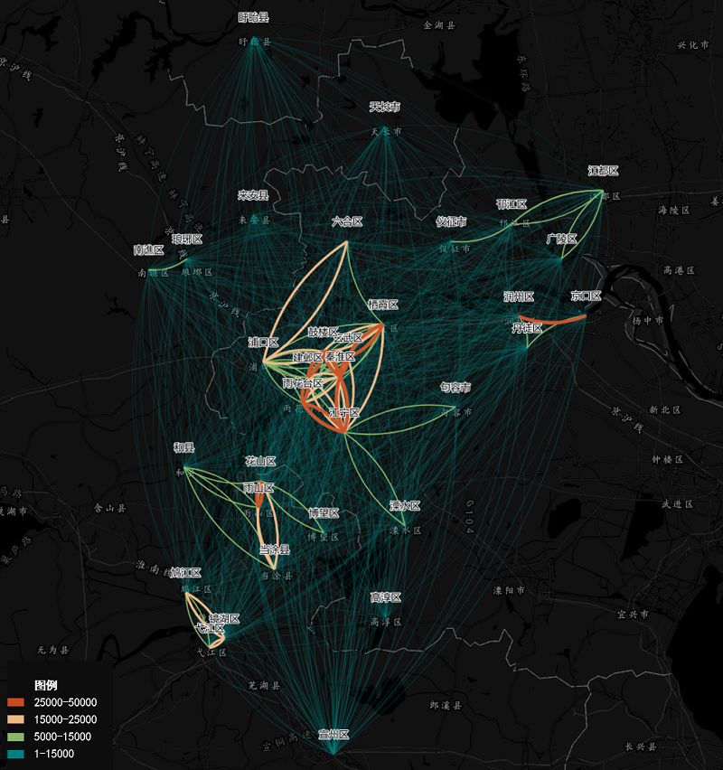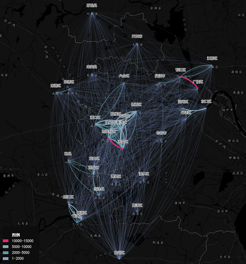 都市圈作为重要的经济空间载体,人口流动联系是我们在观察都市圈发展同城化、经济联系度等方面的一项重要测度指标。通过手机信令数据绘制的人口流动联系网络图,可以直观看出南京都市圈范围内各区县与中心城市、以及各区县间的人口流动情况。除了中心城市市域范围内密切的人口流动外,周边区县与中心城市的互动日益增强。根据国际经验,通勤率是识别都市圈范围的重要指标。综合国内外研究和国内实际情况,根据手机信令数据识别南京市与周边区县日均通勤人次与该区县居住人口(居住人口数据来源于联通数据公司提供的2019年年均区县居住人口数据。即对用户手机点位信息进行抓取识别,晚间时段月逗留时长最长的用户为该地的居住人口。)比例达0.5%,或周边区县日均流动人次占该区县居住人口比例达到5%的范围,识别出都市圈内与中心城市实际人口联系紧密的范围,可以为确定南京都市圈范围提供数据支撑。