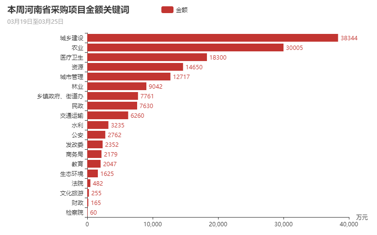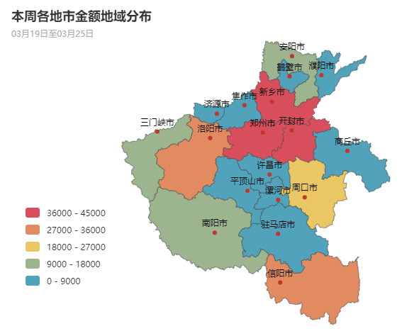 从采购金额总量分布上来看,本周开封市、郑州市、新乡市、信阳市、洛阳市政府采购市场需求占主导地位。