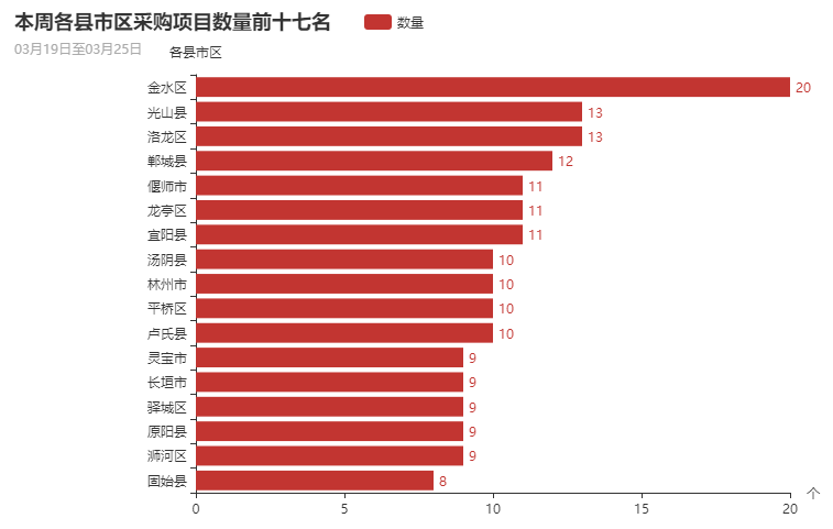 全省各县市区本周采购的项目为507个。县市区排名前十七的依次为金水区、光山县、洛龙区、郸城县、偃师市、龙亭区、宜阳县、汤阴县、林州市、平桥区、卢氏县、灵宝市、长垣市、驿城区、原阳县、浉河区、固始县。排名前十七的各县市区本周采购项目数量总量为184个,占全省各县市区采购总数量的36.29%。