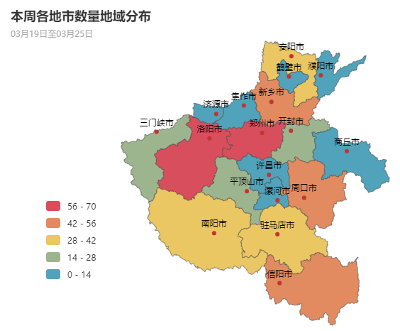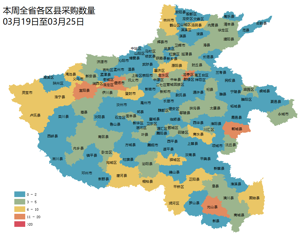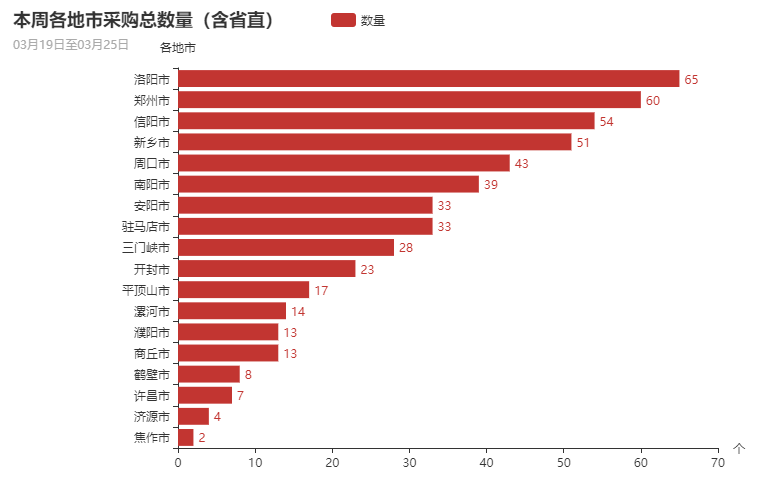 从采购项目总量分布上来看,本周洛阳市、郑州市、信阳市、新乡市、周口市政府采购市场需求占主导地位。