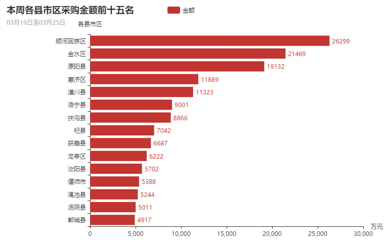 全省各县市区层面政府采购的总金额为28.01亿元。县市区排名前十五的依次为顺河回族区、金水区、原阳县、惠济区、潢川县、洛宁县、扶沟县、杞县、获嘉县、龙亭区、汝阳县、偃师市、渑池县、汤阴县、郸城县。排名前十五的各县市区本周采购项目总额达到15.42亿元,占全省各县市区采购金额的55.05%。