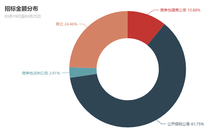 本周政府采购项目中,以公开招标形式采购项目总金额为17.29亿元,占比61.75%;以竞争性谈判形式采购项目总金额为0.82亿元,占比2.91%;以竞争性磋商形式采购项目总金额为3.05亿元,占比10.88%;以其它形式招标(含询价、资格预审)采购项目总金额为6.85亿元,占比为24.46%。根据招标金额统计,采用公开招标形式的项目平均采购金额为971万元,采用竞争性谈判和竞争性磋商形式的项目平均采购金额为116万元和153万元,采用其他招标形式的项目平均采购金额为1141万元。