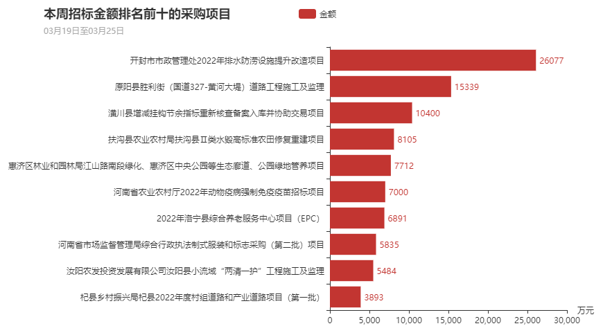 在本周政府采购的507个项目中,招标金额最大的十大项目依次为开封市市政管理处2022年排水防涝设施提升改造项目、原阳县胜利街(国道327-黄河大堤)道路工程施工及监理、潢川县增减挂钩节余指标重新核查备案入库并协助交易项目、扶沟县农业农村局扶沟县Ⅱ类水毁高标准农田修复重建项目、惠济区林业和园林局江山路南段绿化、惠济区中央公园等生态廊道、公园绿地管养项目、河南省农业农村厅2022年动物疫病强制免疫疫苗招标项目、2022年洛宁县综合养老服务中心项目(EPC)、河南省市场监督管理局综合行政执法制式服装和标志采购(第二批)项目、汝阳农发投资发展有限公司汝阳县小流域“两清一护”工程施工及监理、杞县乡村振兴局杞县2022年度村组道路和产业道路项目(第一批)。该十大项目招标总金额为9.67亿元,占本周项目招标总金额的34.54%,其中排名第一的是开封市市政管理处2022年排水防涝设施提升改造项目,招标金额为2.61亿元,占本周项目招标总金额的9.31%。