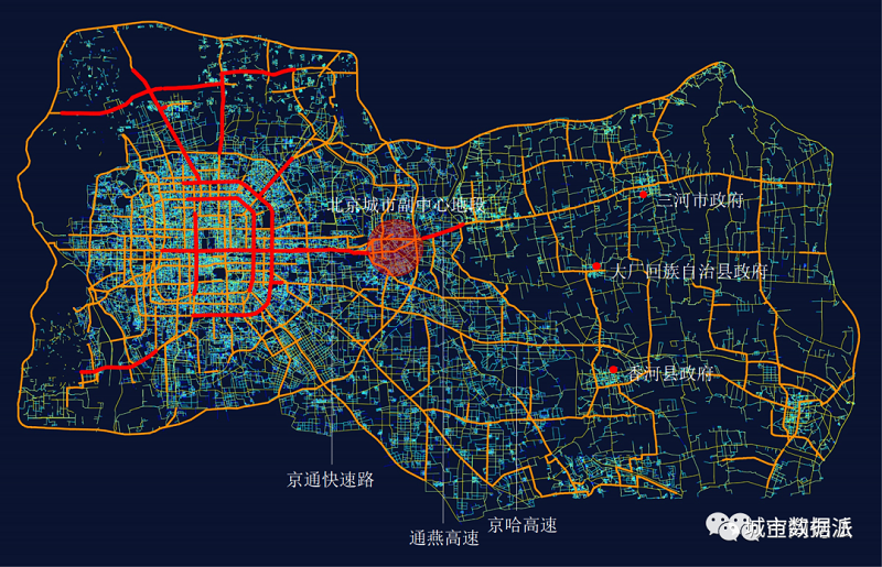 2016年,北京市组织开展了副中心总体城市设计和重点地区详细城市设计方案征集工作,坚持高起点、高标准、高水平,落实世界眼光、国际标准、中国特色、高点定位的要求。12家国内外团队入围该征集工作,落实“构建蓝绿交织、清新明亮、水城共融、多组团集约紧凑发展的生态城市布局”的规划设计理念。本小节讨论的空间句法应用是基于北京市建筑设计研究院和英国福斯特事务所联合体的方案。由于北京城市副中心就是通州,位于北京主城区和河北的三个县(三河、大厂、香河,简称北三县)之间,那么方案试图从更为广泛的区域去判断通州155平方公里的地界内的空间结构及其对外联系。因此,空间句法的模型包括北京六环以内的地区以及北三县(如图4)。