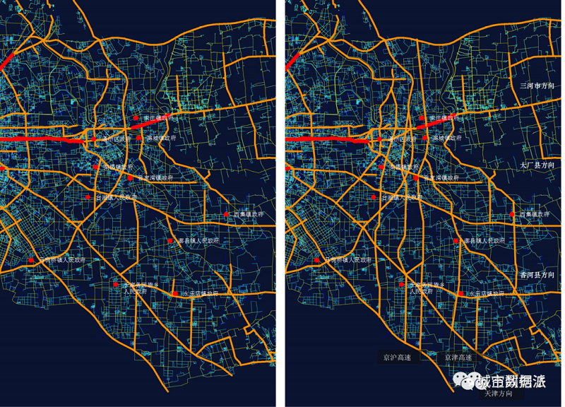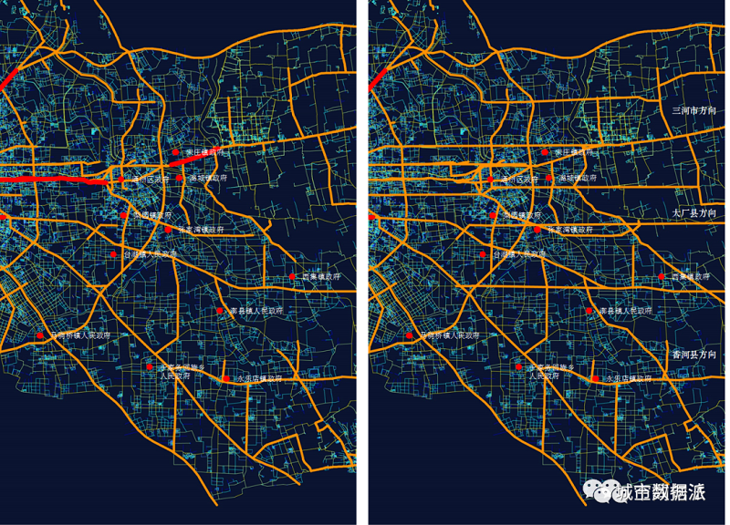 图6 副中心及周边的现状空间分析(左)和连接南北向可能空间通道的分析(右)(红色点表示区和镇政府所在地)