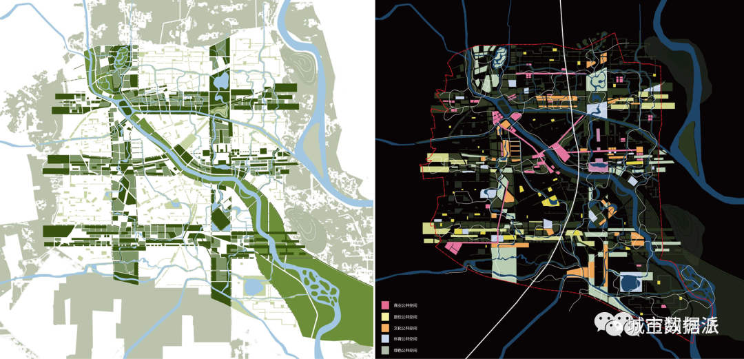 基于空间句法分析和测试,并结合现状情况,方案确定了南北向、东西向穿过副中心内部的空间通道位置,形成三横两竖的绿色健康服务轴(图7左),同时也确定了服务轴中文化、体育、商业、娱乐等不同用地的位置(图7右)。