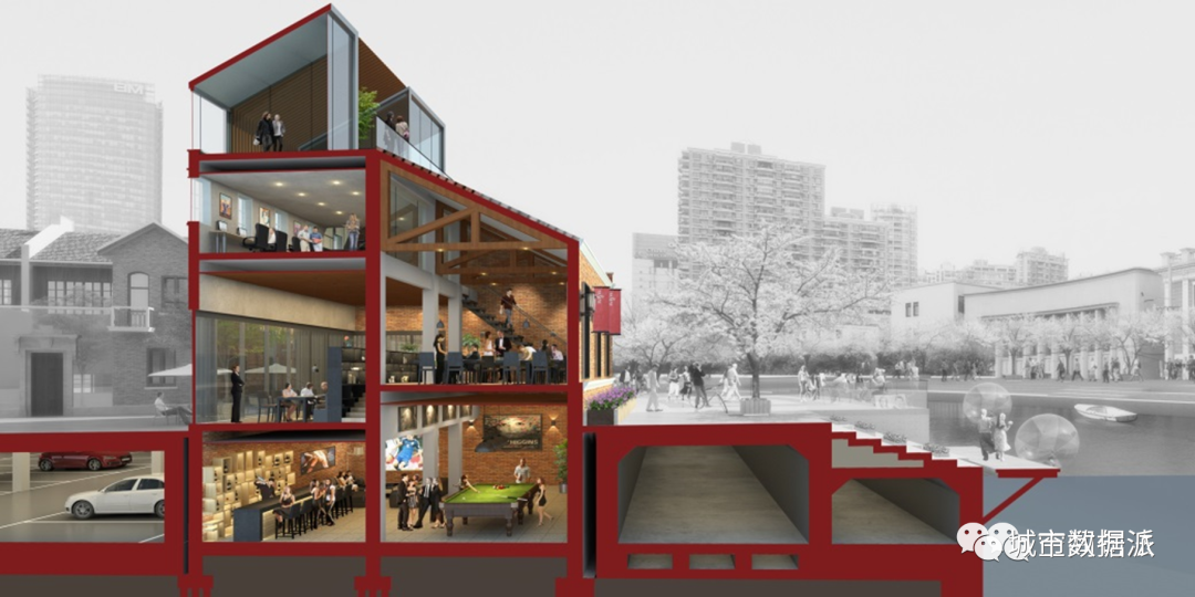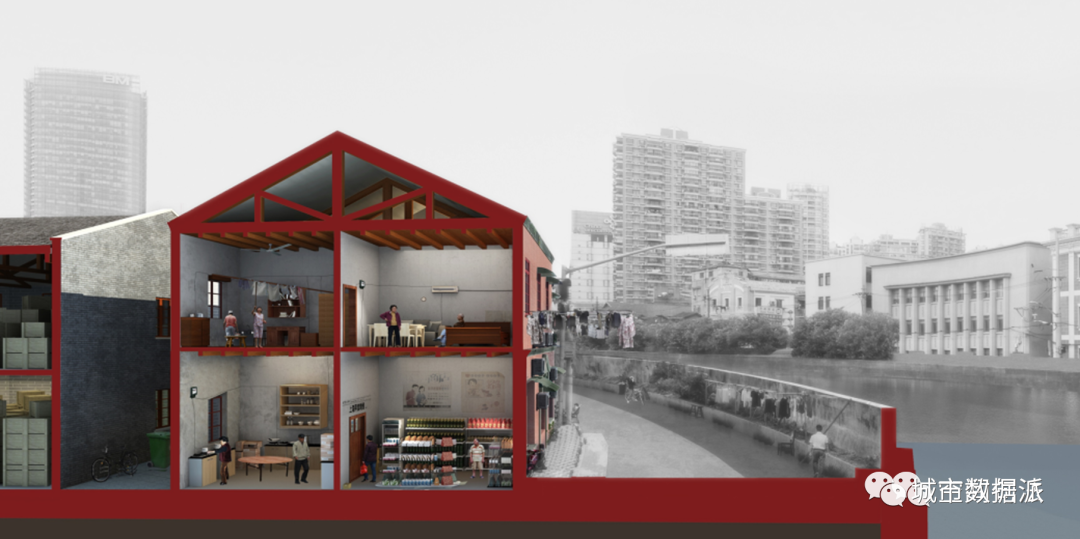 最后,根据空间句法计算,确定建筑物功能的更新模式。在保持空间格局大体不变的前提下,适度地拆除了一些违章搭建构造物,改善局部空间品质(图11)。特别是在沿河地段抬高了道路,增加了局部泄洪基础设施,并改为步行地区,使得地段内部能直接与虹口港对话。与之同时,适度增加虹口港滨水空间界面的商业与娱乐休闲功能,并结合老旧建筑改造,充分利用屋顶空间,局部地增加建筑高度(图12),增加滨水空间的活力密度,从经济上促进城市更新的有效开展。