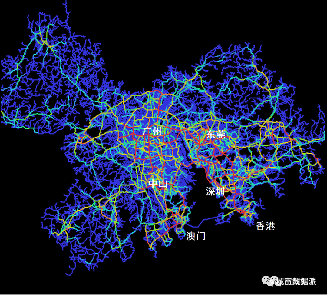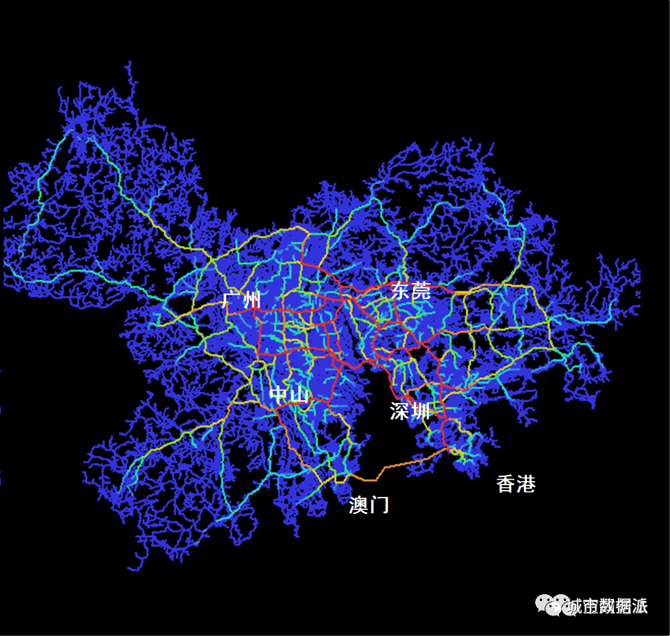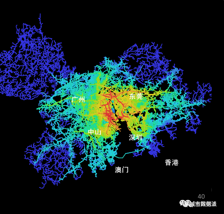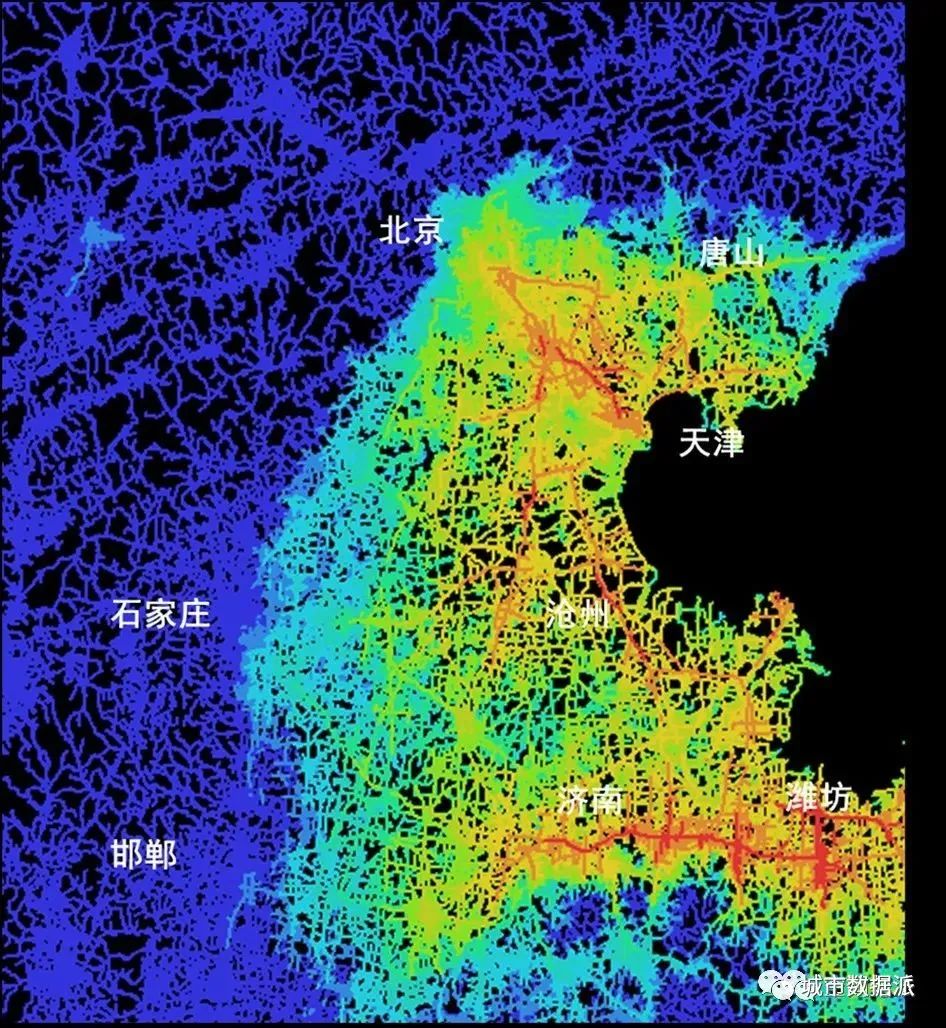 我国三大城镇群包括京津冀、长三角和珠三角,它们的空间形态结构是怎样构成的?在该研究之中,空间句法采用了空间效率和空间整合程度的变量,前者描述空间使用效率的高低,揭示空间发展的方向和城镇之间的空间联系紧密程度;后者描述空间可达性的高低,揭示了空间重心的位置(杨滔,2016)。不同尺度下的分析,将形成空间的图谱,其中红色表示高;蓝色表示低。