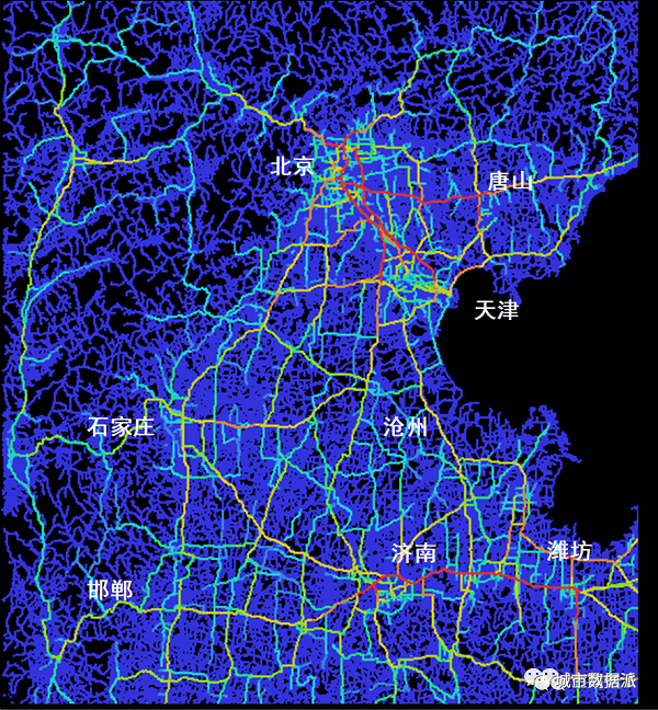 图4 北京和北三县空间句法分析(红色表示可达性高,蓝色标示可达性低)