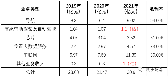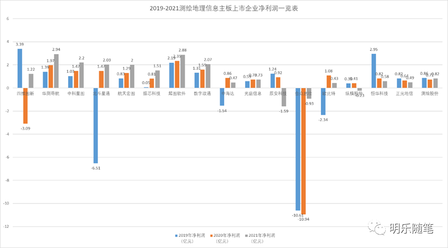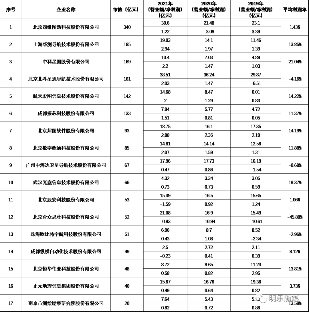 通过对测绘地理信息行业主板上市企业市值数据整理(市值统计为2022年8月1日数据),其中四维图新以340亿元高居榜首第一名;100-200亿之间的有5家,分别为华测导航、中科星图、北斗星通、航天宏图、振芯科技;50-100亿之间的有7家,分别为超图软件、数字政通、中海达、光庭信息、辰安科技、合众思壮、欧比特;50亿以下的有4家,分别为纵横股份、恒华科技、正元地信、测绘股份。从以上数据可看出,大部分测绘企业的市值偏小,100亿以下市值企业数量占比65%。而且,有软硬件产品的公司市值偏大,四维图新因自动驾驶概念,市值较高;正元地信以及测绘股份,主要是测绘项目,市值相对偏小。2、测绘地理信息行业主板上市企业近三年营业收入情况从营业收入绝对值来看,整体收入分为两个层次,中位数在15亿左右和5亿左右,15亿左右的企业有10家,分别为四维图新、华测导航、北斗星通、航天宏图、超图软件、数字政通、中海达、辰安科技、合众思壮、正元地信;5亿左右的企业有7家,分别为中科星图、振芯科技、光庭信息、欧比特、恒华科技、纵横股份、测绘股份。从营业收入增长趋势来看,有10家企业实现了近三年营业收入的正增长,分别为华测导航、中科星图、北斗星通、航天宏图、振芯科技、数字政通、中海达、光庭信息、合众思壮、测绘股份;四维图新、超图软件实现了先下滑,后增长;辰安科技、欧比特、纵横股份则是先增长后下滑;恒华科技、正元地信则是连续下滑。从数字上来看,测绘地理信息行业主板上市企业受疫情影响不大。令人比较感慨的是,从身边小型的测绘地理信息企业来讲,日子并不好过,突然听闻企业倒闭的消息也不少,但是大企业的业绩整体上来看都还是有保障的。从净利润的绝对值来看,整体净利润不高,大致也可以分为两个层次,一个是2亿左右,一个是1亿以下。2亿左右净利润的企业有9家,分别为四维图新、华测导航、中科星图、北斗星通、航天宏图、振芯科技、超图软件、数字政通、恒华科技;1亿以下有,中海达、光庭信息、辰安科技、合众思壮、欧比特、纵横股份、正元地信、测绘股份。其中,四维图新、北斗星通、中海达、辰安科技、合众思壮、欧比特均出现过严重亏损,其中合众思壮连续三年均出现亏损,而且在2019-2020两年亏损均超过10亿。由于测绘地理信息企业上市后,因为业绩增长的需求以及销售渠道的相似性,基本上都会扩大业务范围以增加企业的业务收入,并且增强企业的技术能力。同时,由于面临新型业务,都是3S+ICAT技术的混合,因而整体上呈现业务互相融合的趋势。为了叙述的方便,还是根据主营业务方向对现有公司进行一个分类:2019年、2020年,均是以“智能汽车大脑”为战略目标,以数据、算法和算力为核心,构建“数据+云+AI+芯片+软硬一体化”综合解决方案,在持续保持导航业务行业领先地位的同时,加速推进高精度地图、高精度定位、自动驾驶、汽车电子芯片、位置大数据、车联网等新业务的商业化进程。2021年,通过全栈布局形成智云、智驾、智舱、智芯的新型业务体系,初步完成向智能出行科技公司的战略转型,实现向第二赛道城市智能化的成功拓展。由于2021年,开始以智云、智驾、智舱、智芯的业务逻辑在分类,部分数据不太好确认。但是从整体上来看,导航、芯片、位置大数据服务、车联网业务增长比较明显,尤其是位置大数据服务和车联网业务。公司的主要客户是面向车厂和政企用户。位置大数据服务主要面向交警、公安、交通、规划、保险、运营商等系列行业整体解决方案。车联网主要为车厂提供地图全量或基于NDS图幅(tile-based)的格式转换编译及在线更新、实时动态交通信息、在线运营服务、多模态导航软件、自动驾驶云平台、合规存储及托管、新能源汽车智能出行及一体化解决方案。从整体的业务划分上来看,公司业务重心越来越偏向于汽车服务。光庭于2022年5月上市,是上述公司中最晚上市的。公司自成立以来坚持聚焦于智能网联汽车软件的研发与创新,面向汽车零部件供应商和汽车整车制造商提供专业的定制软件开发与技术服务,紧密围绕汽车网联化、智能化和电动化进行技术创新与业务开拓。定制软件开发主要针对智能座舱、智能电控应用软件开发;软件技术服务,主要指为客户提供专业的技术人员参与其软件开发与测试服务;第三方测试,主要针对智能网联汽车测试;软件许可,主要针对自主研发的软件产品,按许可数量或者时间收取费用;系统集成主要指是基于地理信息系统(GIS)的各类行业应用。从以上业务及比重来看,光庭信息涉及到的测绘地理信息相关的只有系统集成以及移动地图数据服务。其中系统集成业务比例极低,移动地图数据服务占比13%。可见,光庭信息主营收入已经是面向汽车的软件服务,与四维图新有些类似,早已是脱离了传统的测绘地理信息服务业务范畴。