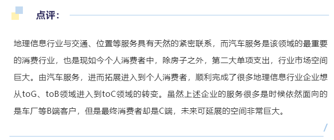 通过对上述17家业务的概览,对当前地理信息市场上的有增长潜力的服务有了初步了解。当然,受限于样本量的大小、资料披露的含糊性以及个人认知水平,我的结论较大可能有失偏颇,仅供参考。从四维图新、北斗星通、光庭信息几家企业来看,业务和利润较好的版块都是围绕汽车软件、智能座舱等汽车服务。当然,北斗星通、光庭信息的汽车软件、测评等服务,已经和测绘地理信息无关了,四维图新对汽车的服务早已经不再局限于导航地图。因而,从业务重心和市场需求端来看,汽车市场相对测绘市场来看确实是一个更大的市场。所以,换个层面来看,通过地理信息与其他ICAT技术融合,对汽车提供服务,会是一个比较好的业务方向。随着北斗全球组网的成功,围绕北斗的接收机、芯片、终端设备等出货量持续不断增长,市场应用越来越广,围绕北斗的服务应用也不断扩大和成熟,从北斗星通、振芯科技、中海达、合众思壮几家企业的北斗版块的业务增长就可以佐证。我相信,随着中国在全球的影响力不断扩大,以及北斗芯片等底层技术的持续突破,北斗未来还将面临着广阔的应用前景。GIS是测绘地理信息行业面向其他行业的窗口,测绘的所有数据和核心技术都需要通过GIS平台对外进行展示和应用,也是用户直接接触的业务系统。因而,GIS平台是测绘地理信息行业全面拥抱其他行业的、深入其他行业不可或缺的媒介。同时,在上述企业开展业务过程中,不仅GIS企业在使用GIS平台,测绘服务企业在用GIS平台和技术,甚至GNSS企业在面向客户的时候也需要GIS平台去面向客户的业务。与此同时,现在的GIS服务已经不再仅仅是展示测绘技术的综合媒介,而是需要与客户业务深度融合的综合服务型平台,甚至在这种综合服务过程中,测绘地理信息的概念和成分逐渐退居到一种支撑地位,不再作为核心业务去展示。从辰安科技在安全领域的专业化、数字政通在城市治理等领域的深入可见一般。