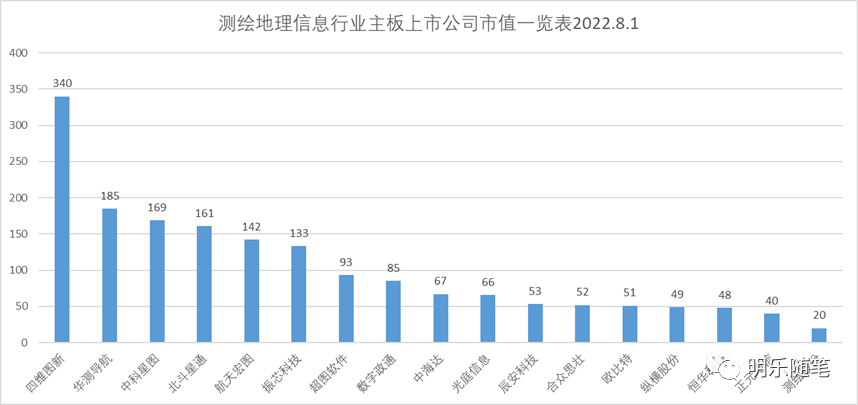 曾经“青春才几年,疫情占三年”一句话引起了广大吃瓜群众的共鸣,生于这个大动荡时代,个人、企业、国家的命运从没有如此紧密相连过。百年一遇的新冠疫情以及连绵不绝的后疫情时代、中美贸易战带来的逆全球化、俄乌战争和台海危机引发的军事冲突等等,致使中国经济遭遇了重大挑战。虽然,我对中国经济的发展持长期乐观的态度,但是低增长将会是未来的一种常态。支撑国家经济的发展,是由行业发展状况以及行业中具体的企业发展状况来决定的。疫情这三年,测绘地理信息行业的发展又如何呢?根据上述公开数据,地理信息产业总产值的增长率已经降到10%以下,但是仍然高于国家经济的增长率。在现实中,很多小微公司都撑不小去了,大企业的发展又如何呢?我觉得,在危机中,大家迸发出的求生欲会更强。我希望,通过对主板上市公司的发展状况进行研究,既可以了解行业趋势,也可以看看这些企业在哪些方面有新的突破,而这些新业务的拓展,又会带给我们什么样的启示?截止到2022年8月,测绘地理信息行业主板上市公司主要如下: